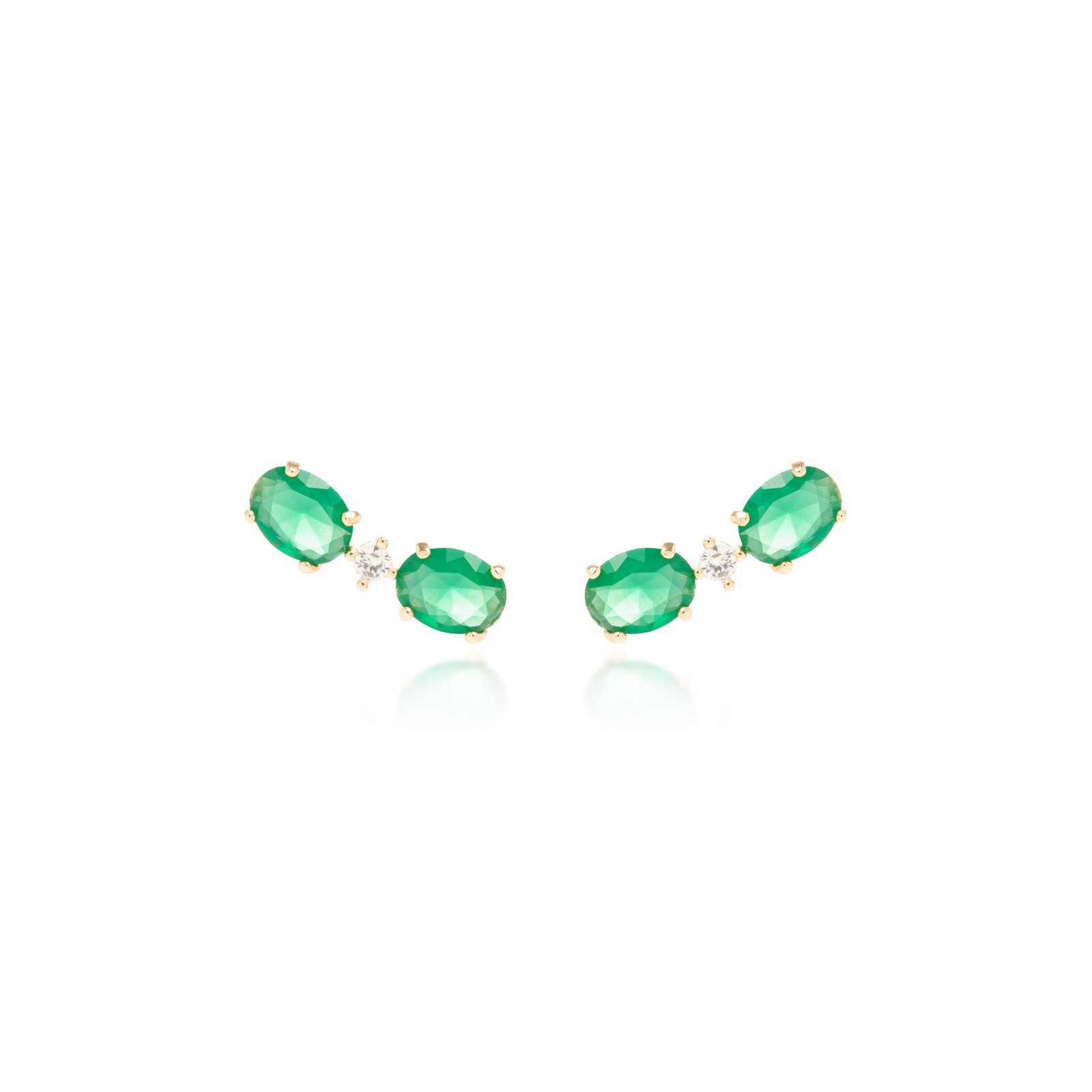 Com design delicado e moderno, este ear cuff é composto por três pedras ovais na exuberante tonalidade verde-esmeralda, intercaladas por brilhantes zircônias que adicionam luminosidade e sofisticação. Cravadas em garras douradas discretas, as pedras criam um efeito levemente curvado que acompanha a linha da orelha com elegância.