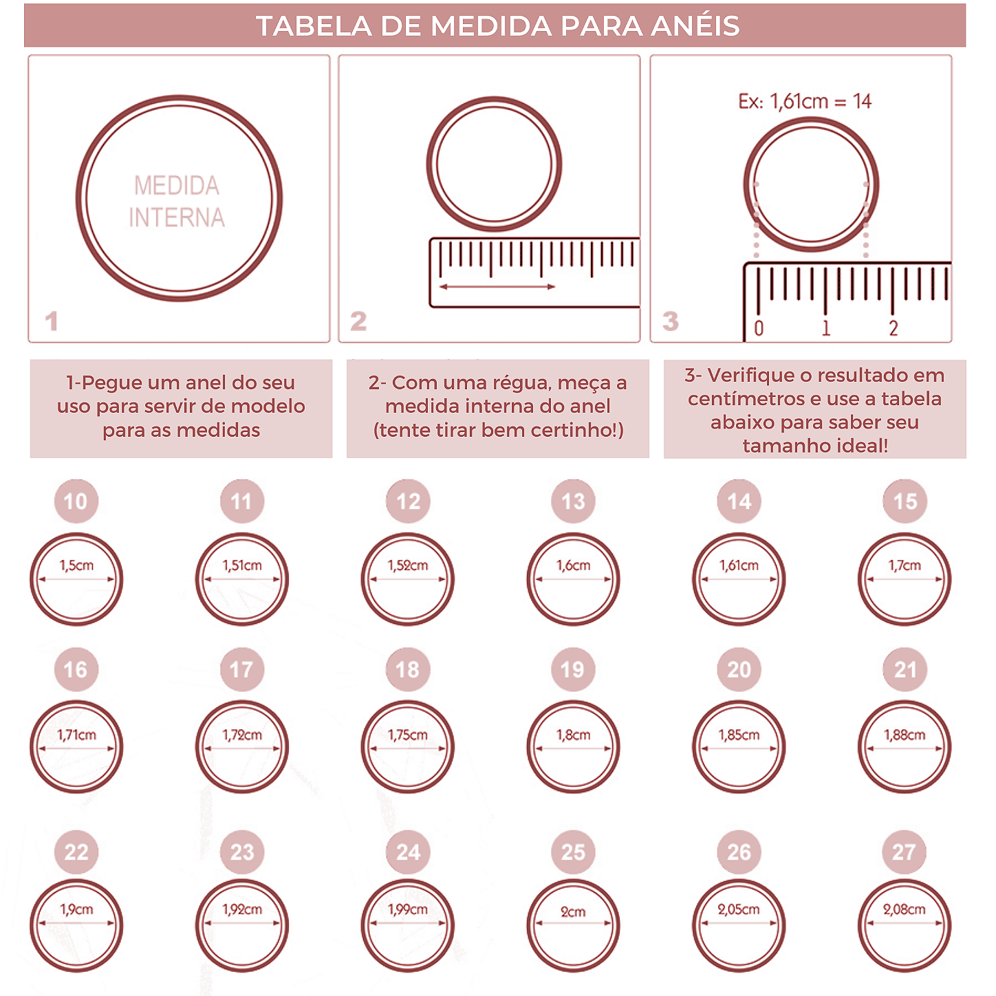 Com a ajuda de uma régua ou ferramenta similar, meça a parte interna de um anel que já seja do seu tamanho. Atenção: meça somente a parte INTERNA, sem incluir as bordas. Certifique-se de que o valor esteja em milímetros (1 cm = 10 mm). Depois, compare com os padrões apresentados na tabela de tamanhos e solicite o anel no tamanho correto.